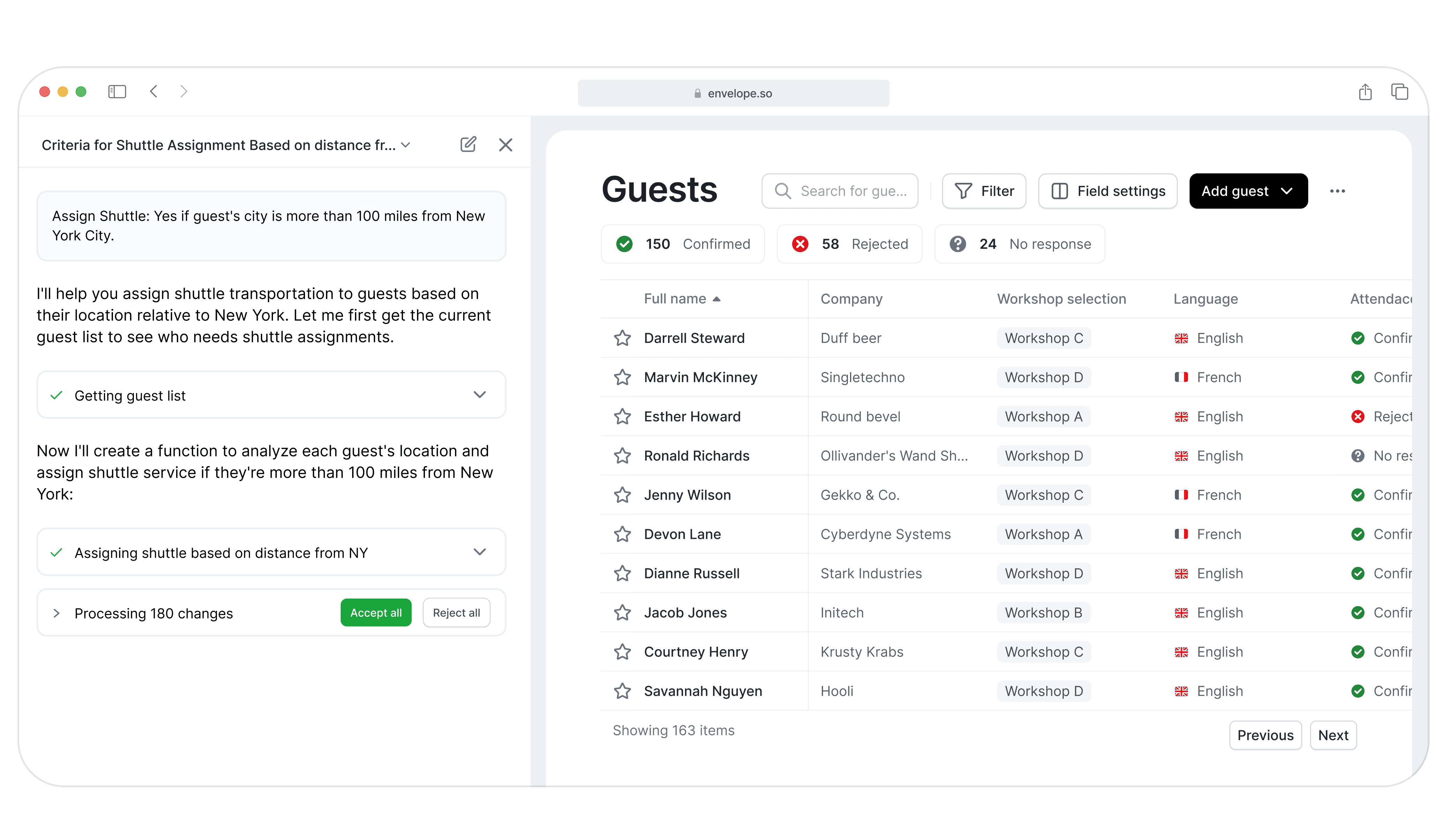 Update thousands of guests at once. Use AI to assign seating, group by location, or flag those eligible for a shuttle.