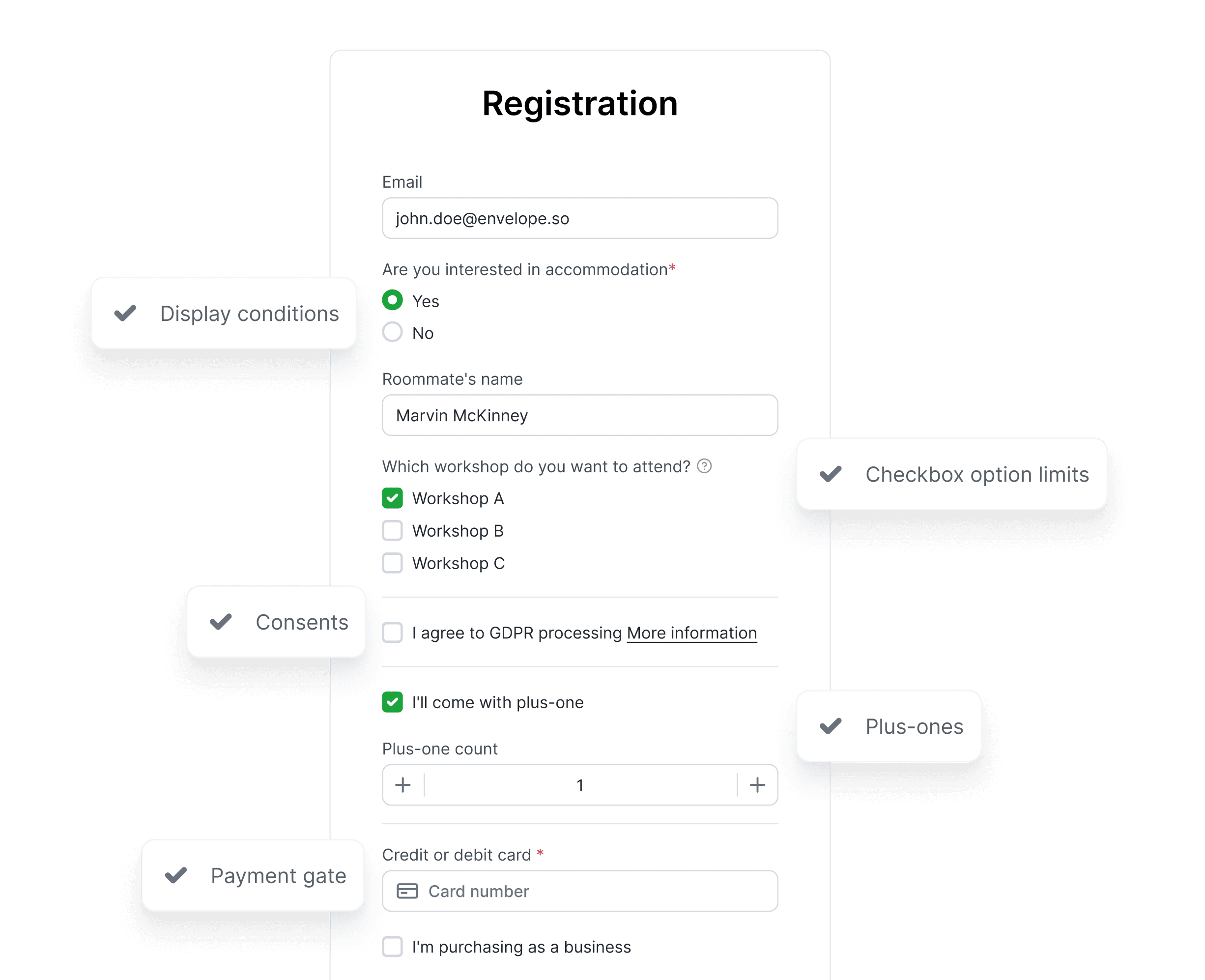 Build forms with conditional logic, capacity limits, plus-one handling, and required consents. Everything adapts to your event’s needs.