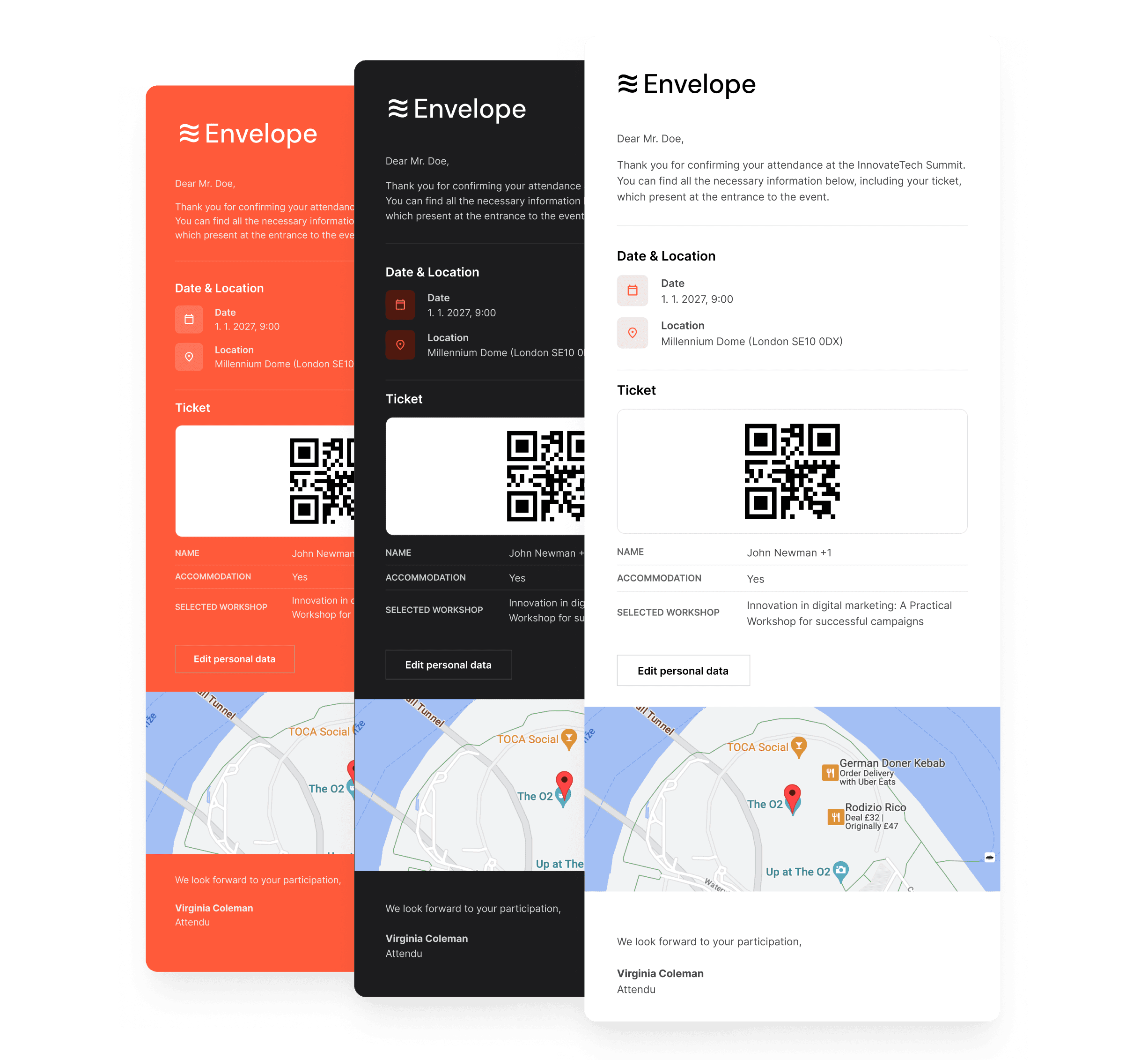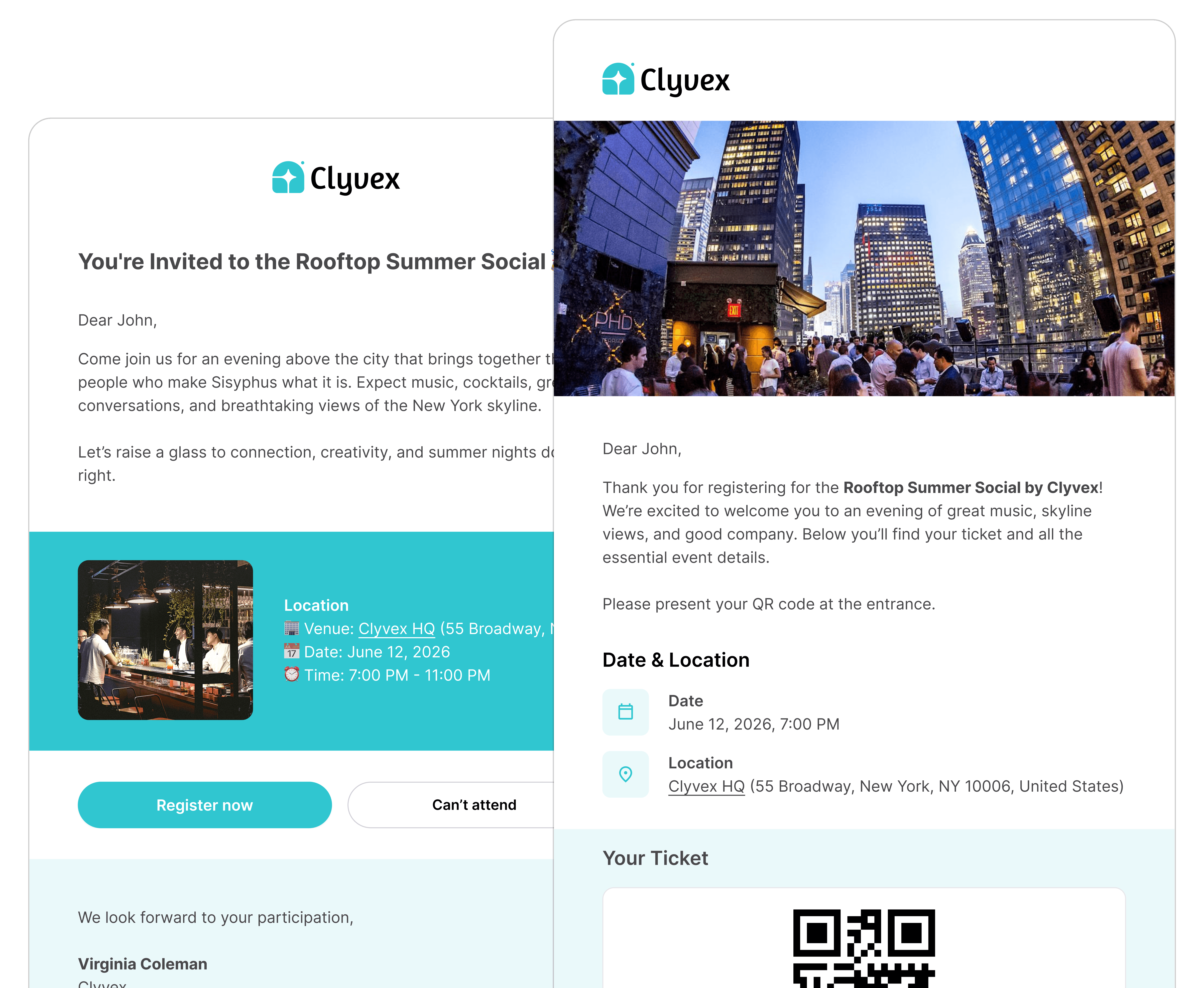 Send RSVP invitations, tickets, reminders, updates, and thank-you letters that look and feel like your brand.