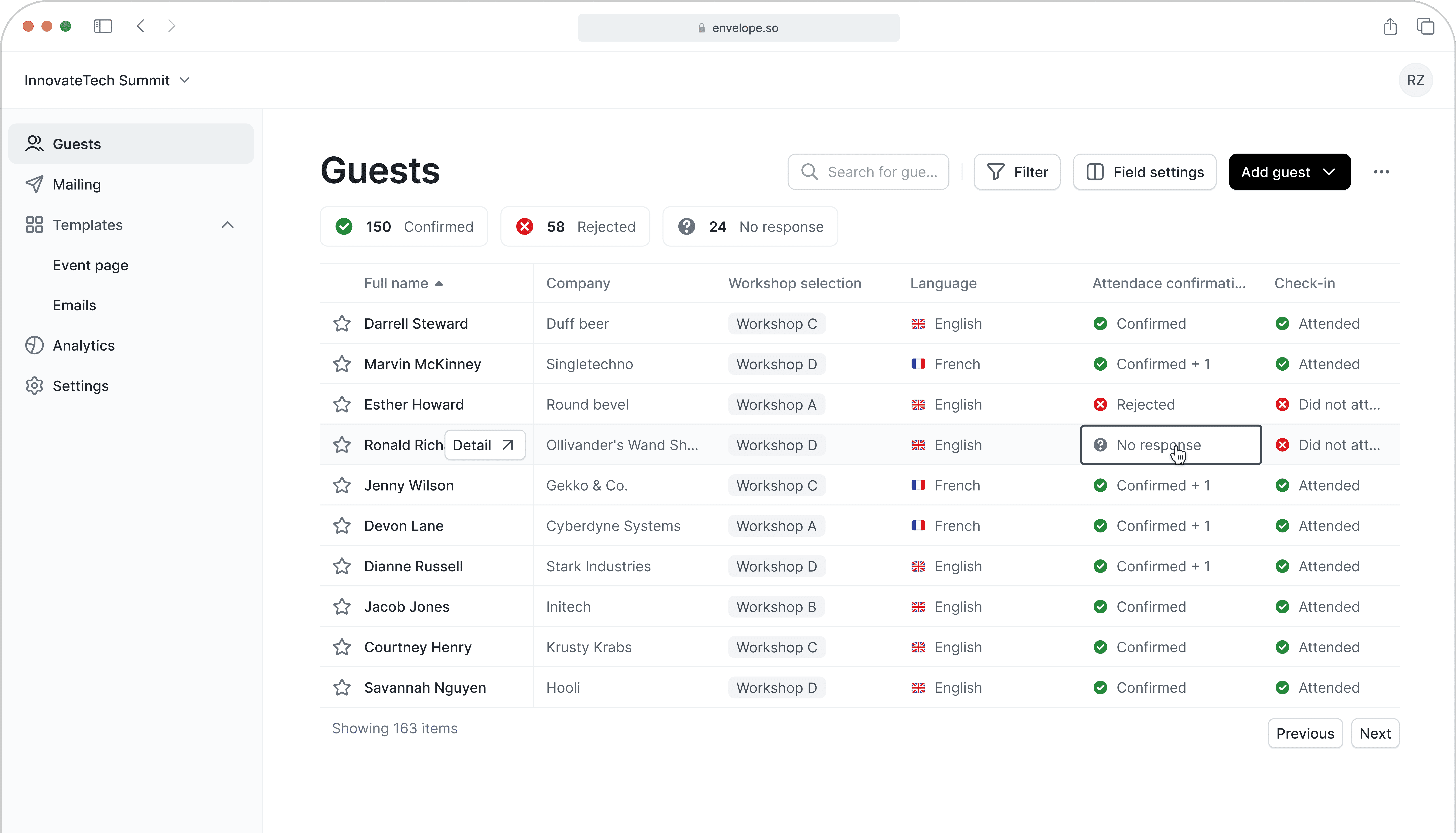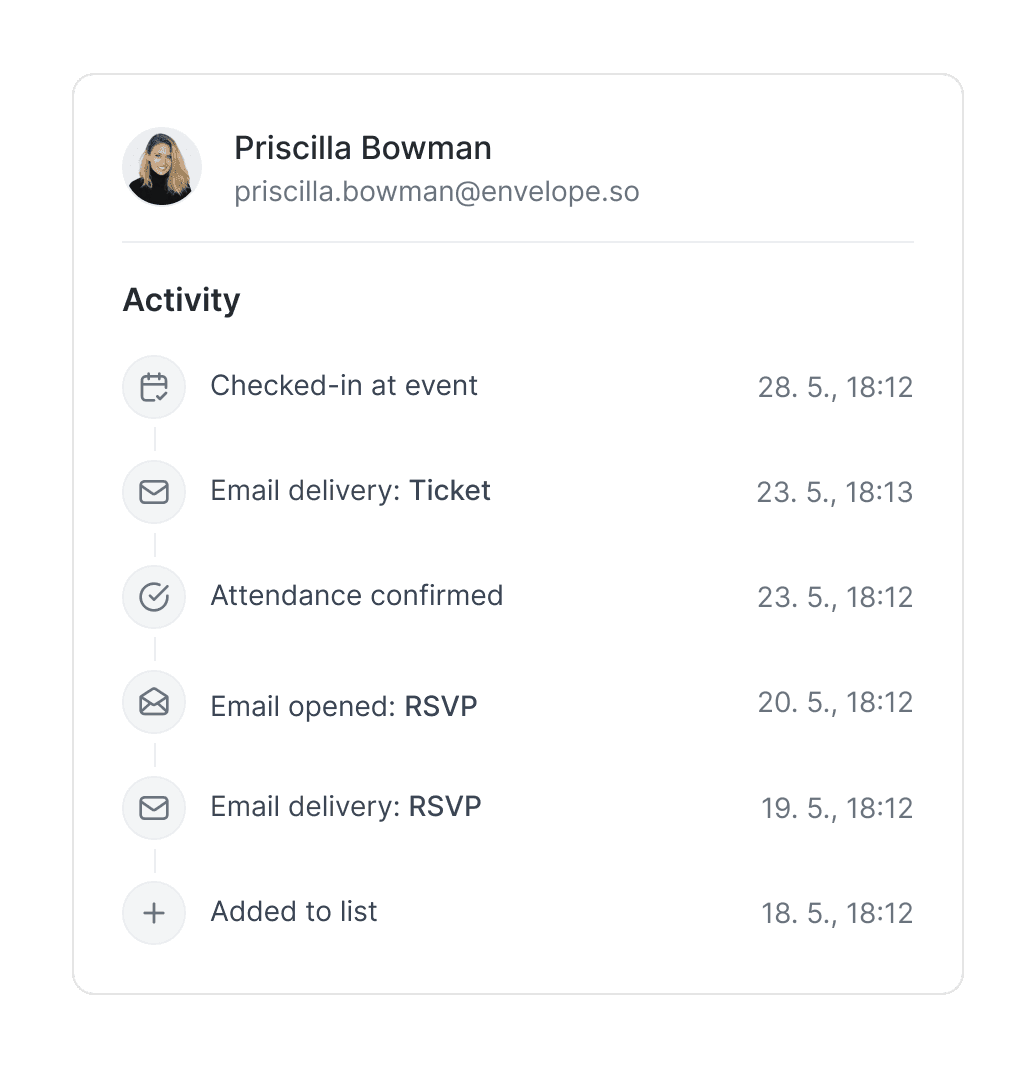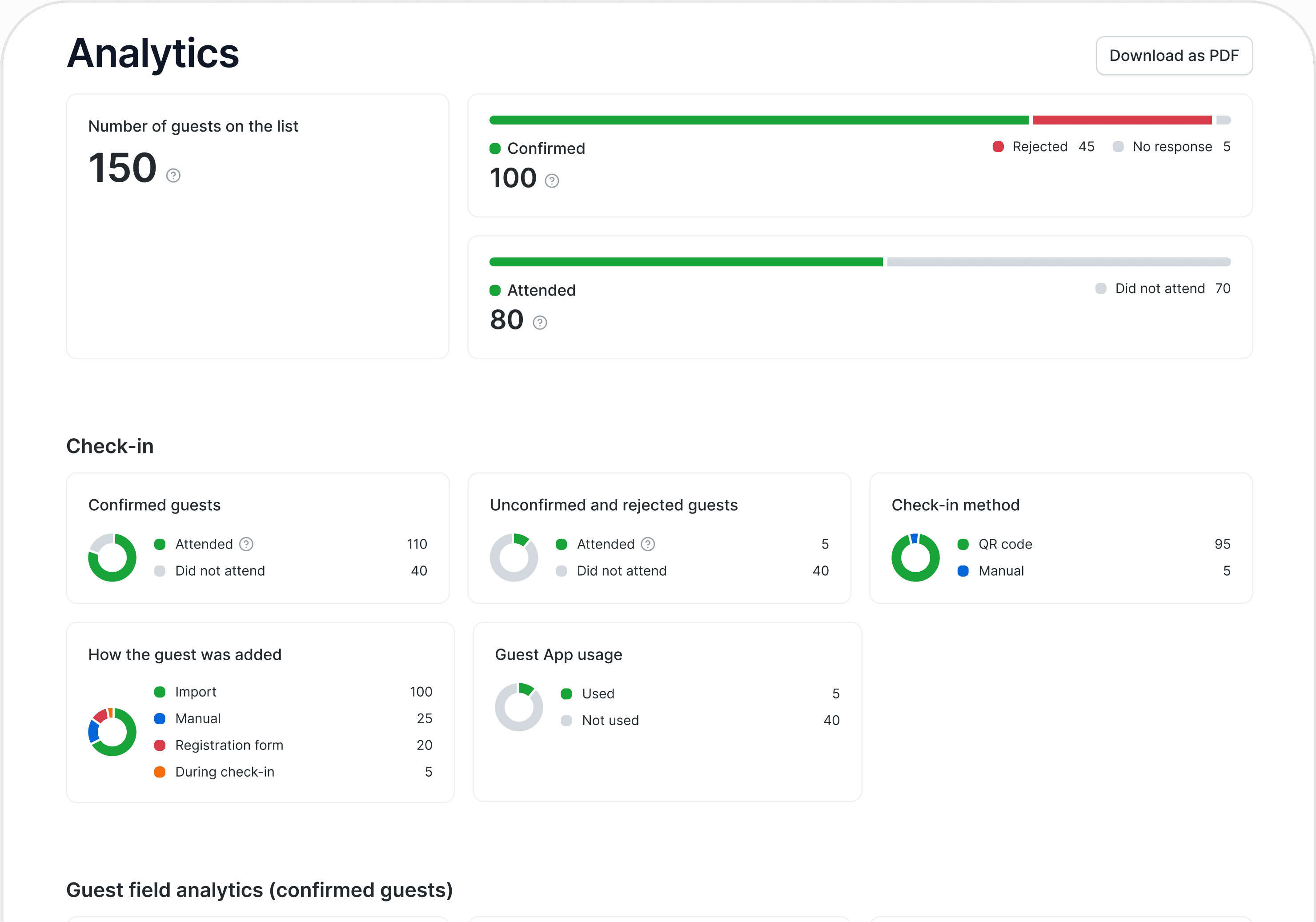 Monitor opens, check-ins, confirmations, and attendance. All data is tied to individual guests across the journey.